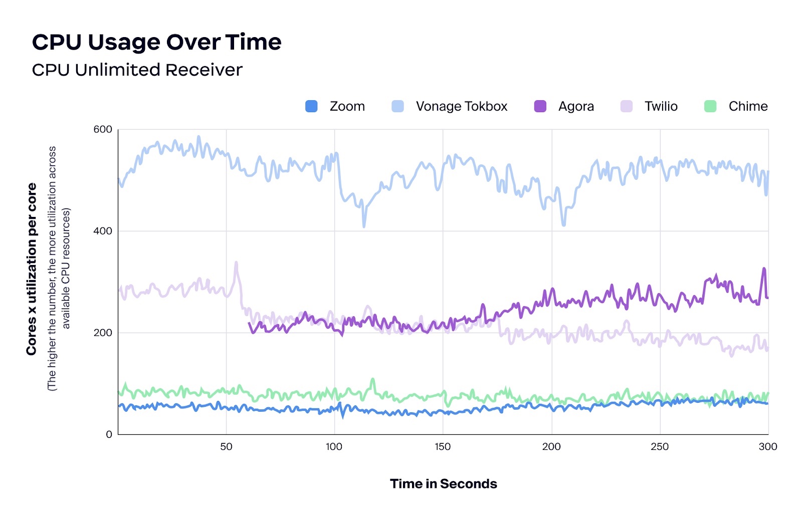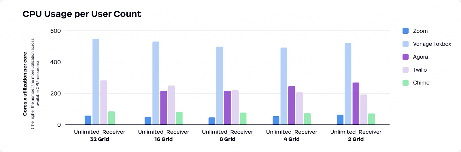 Zoom Video SDK CPU utilization per user is lower compared to Vonage Tokbox, Agora, Twilio Programmable Video, and Chime.
